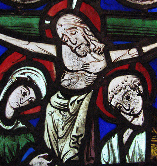 This was the first thing to strike my eye. Described only as French, 12th Century, I believe. A rather 'cool' looking crucifixion. Crucifixion scenes are relatively rare in stained glass and I find this one rather curious. The figure of Jesus almost seems more in a state of sad revery or meditation rather than in one of suffering. I love the linework throughout. I'm curious about the two face/figures above the cross - angels peeking through the clouds? It doesn't ring a bell iconographically.