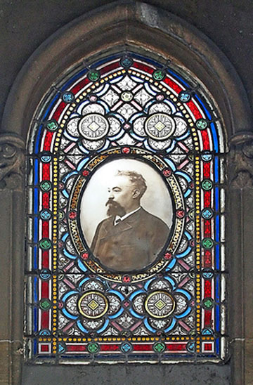 This is a stained glass panel from a cemetery in Montmartre, Paris. I'm not sure if the technique used was an actual photographic positive put into a stained glass window or a process using decals or some such method to make a more permanent adhesion to the glass. Most of the attempts to include actual photographic plates into stained glass failed because the photographic chemicals could not hold up over time in the constant transmitted light.