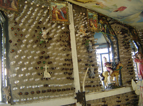Via Extreme Craft, a flickr set of Tia's Tacos, in Riverside CA, with its folk art environment including a bottle wall chapel. Alas, the only interior shot...