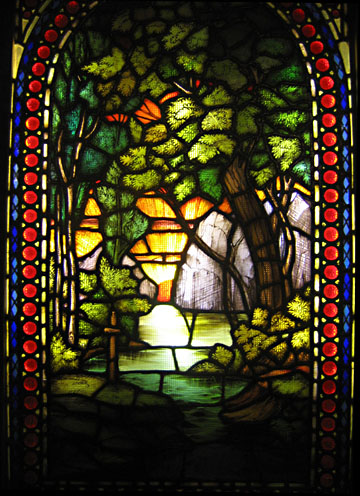 I suspect that this might be a mausoleum window, especially after I came across this image of this stained glass in Flushing Cemetary.