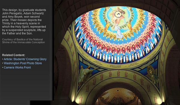 Article in the Washington Post called 'Students' Crowning Glory - Two Catholic University Freshmen Win Contest to Adorn D.C. Basilica's Dome'.
